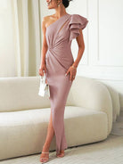Αυτή η μακριά φόρεμα έχει ρευστή γραμμή με γυμνό ώμο. Οι επάλληλες φούστες και η πλαϊνή σχισμή προσθέτουν μια πινελιά κομψότητας. Ιδανικό για γάμους, βραδιές και άλλες επίσημες περιστάσεις.