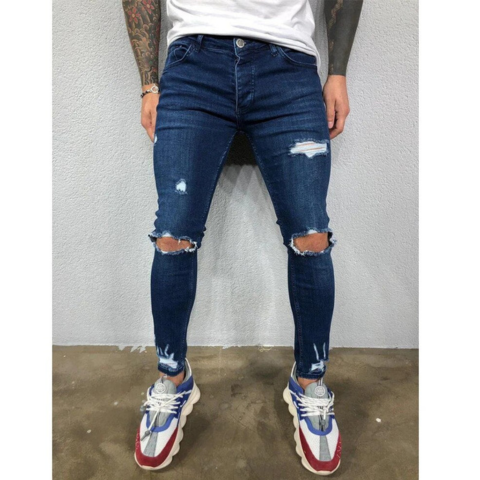 Αυτό το σκισμένο παντελόνι προσφέρει μοντέρνα και εφαρμοστή γραμμή. Διαθέσιμο σε μπλε και μαύρο, προσαρμόζεται εύκολα σε όλες σας τις εμφανίσεις. Ιδανικό για μια χαλαρή και κομψή εμφάνιση.