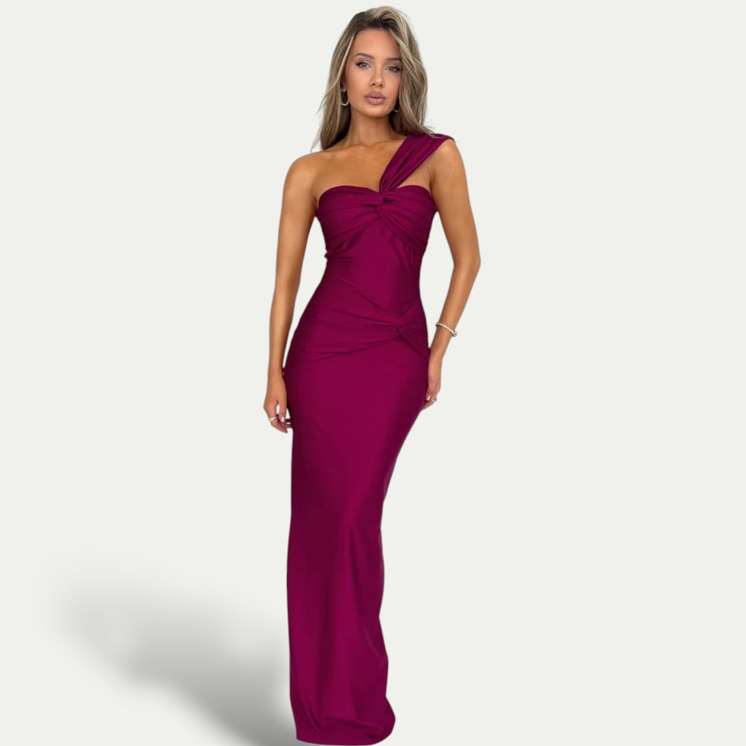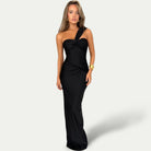 Αυτή η μακριά φόρεμα αναδεικνύει τη σιλουέτα χάρη στη στενή γραμμή της και τον εκλεπτυσμένο ασύμμετρο σχεδιασμό της. Ο λιτός της στυλ προσφέρει μια πινελιά κομψότητας που είναι ιδανική για βραδινές εξόδους και ειδικές περιστάσεις. Ένα κομμάτι κομψότητας που συνδυάζει τη μοντέρνα αισθητική με τη θηλυκότητα με ακρίβεια.