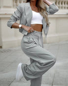 This set combines a structured blazer with matching trousers. It offers an elegant and professional silhouette. Perfect for the office or formal occasions.