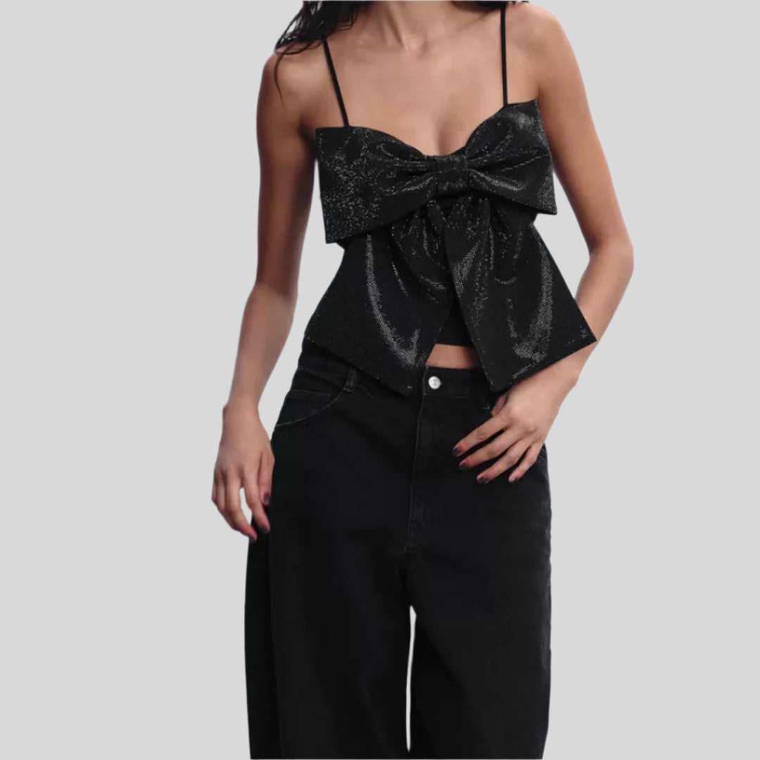 Tässä tyylikkäässä yläosassa on kimaltava muotoilu, jossa on erottuva solmu. Täydellinen erityisiin tilaisuuksiin tai tuomaan hienostunutta ilmettä päivittäiseen asuusi. Saatavilla useissa koossa sopimaan kaikille vartalotyypeille.
