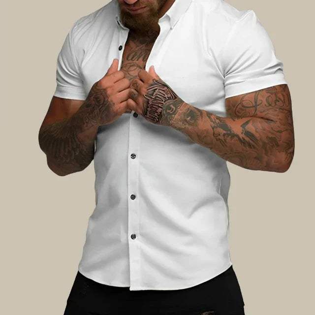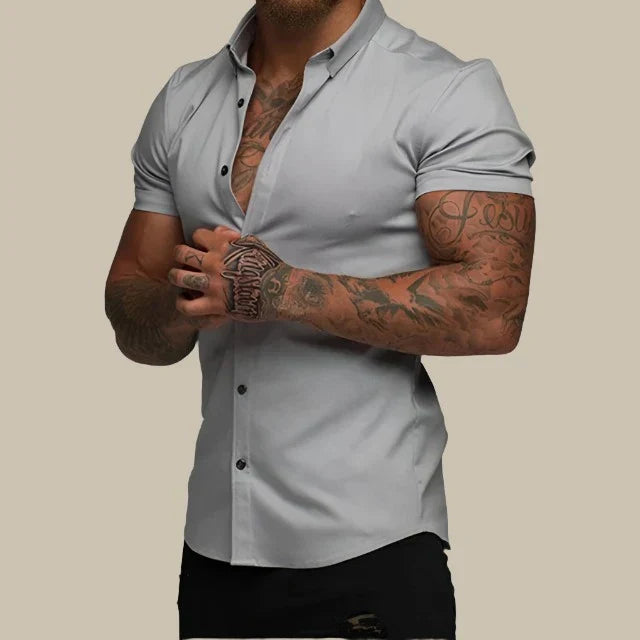Questa camicia aderente unisce eleganza moderna e comfort. Realizzata in materiali stretch premium, offre flessibilità e un aspetto raffinato. Le maniche corte conferiscono una silhouette elegante e rilassata, ideale per i periodi caldi.