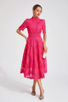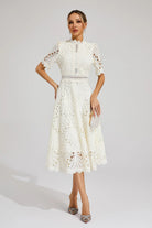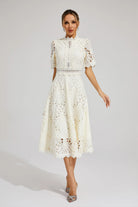 Questo abito presenta accenti di delicatezza e una silhouette midi lusinghiera. Perfetto per matrimoni, garden party o serate intime. Incarnano l'essenza del glamour sottile.