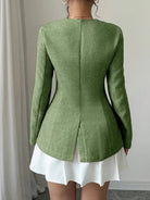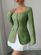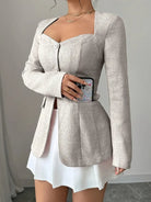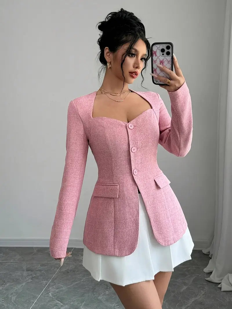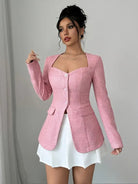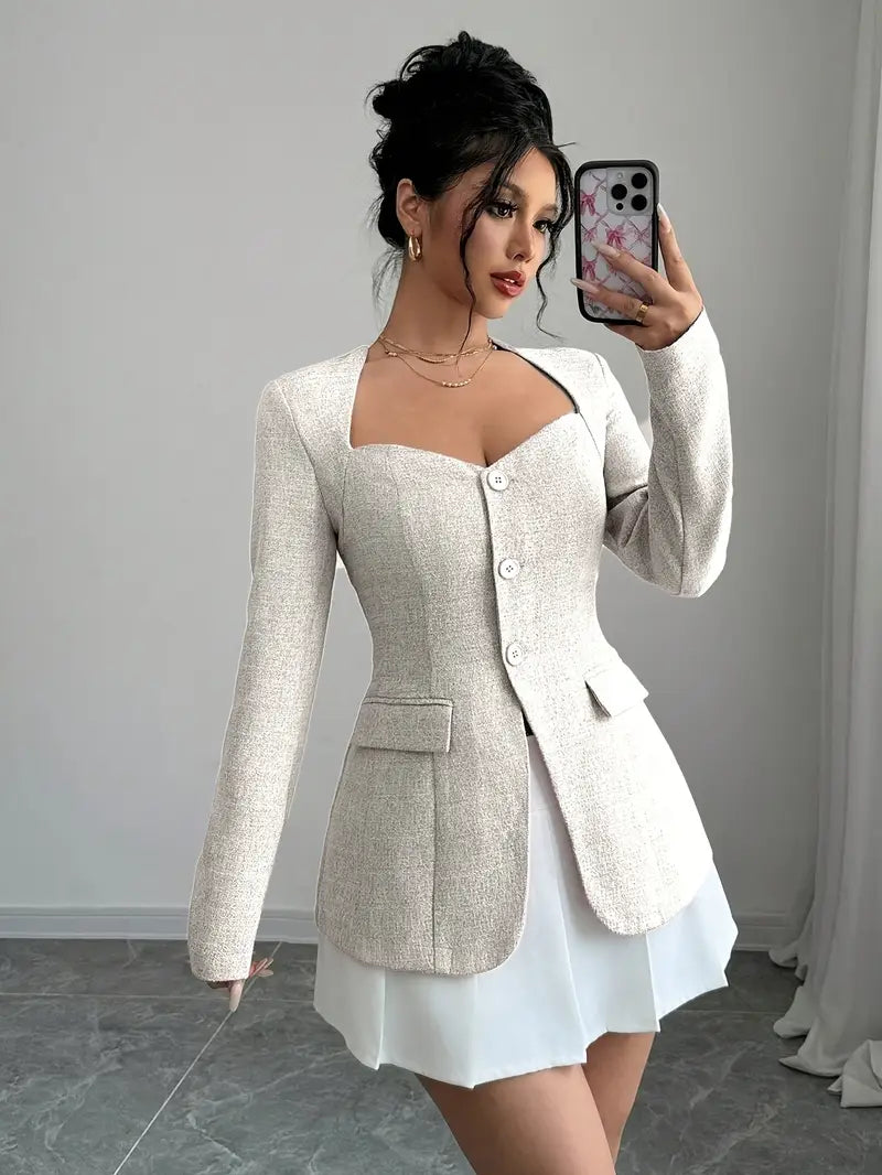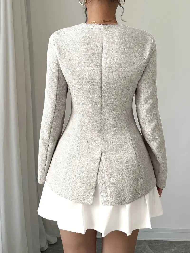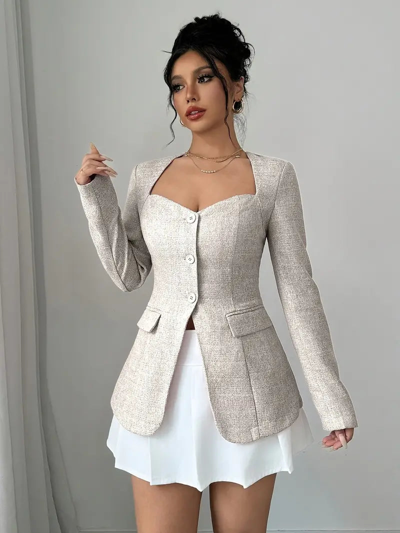 このボタン付きジャケットは、タイトなカットとモダンなスクエアネックでシルエットを引き立てます。エレガントで女性らしい印象を与え、オフィスでも外出時でも着用できます。丁寧なデザインと繊細なボタンが、あなたの装いに時を超えた洗練さを加えます。