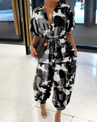 このウエストマークのコンビネーションは、モダンなスタイルと快適なフィット感を提供します。ボタン付きのデザインとタイトなパンツがトレンディなタッチを加え、外出やカジュアルな日々に最適です。