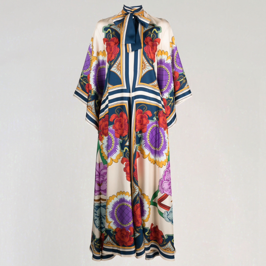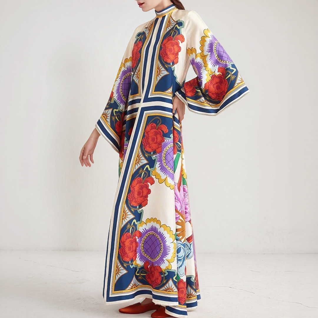 このロングドレスは大胆な花柄と流れるようなシルエットを特徴としています。背中のリボンディテール付きのハイネックが洗練された印象を与えます。すべての季節にぴったりで、時代を超えたボヘミアンエレガンスを提供します。