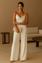 このパンツのコンビネーションは、洗練さと快適さの出会いを体現しています。流れるようなカットがシルエットを長く見せ、シンプルなデザインが現代的なタッチを加えます。フォーマルなイベントやスタイリッシュな外出に最適で、お気に入りのアクセサリーで簡単に格上げできます。