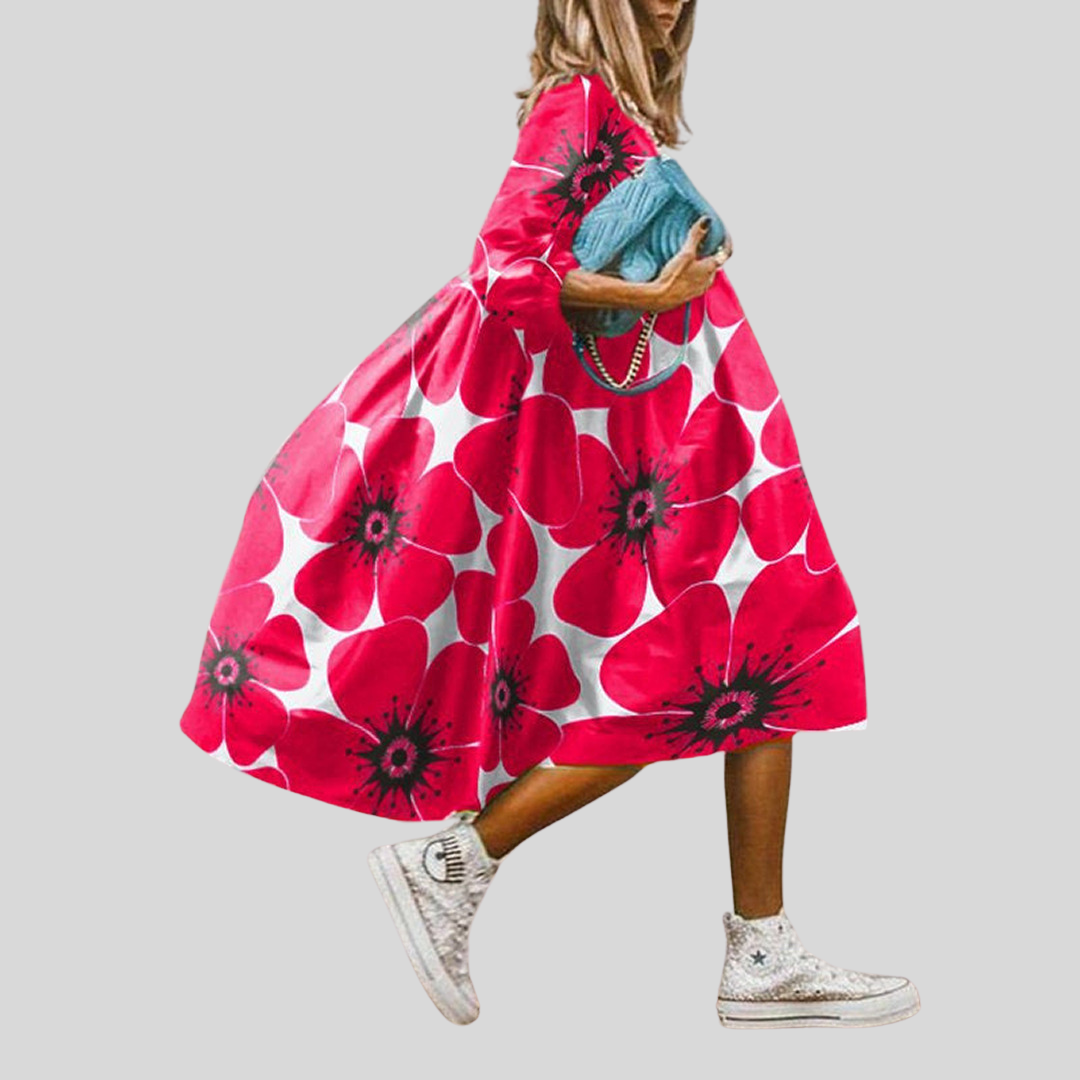 このミディドレスはボヘミアンフラワーデザインを特徴としています。複数の色とサイズで利用可能です。夏の日にぴったりです。