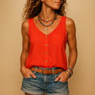 Denne ermeløse toppen med V-hals har en løs og komfortabel passform. Tilgjengelig i flere farger, den passer til alle dine antrekk. Perfekt for varme dager, den kombinerer stil og komfort.