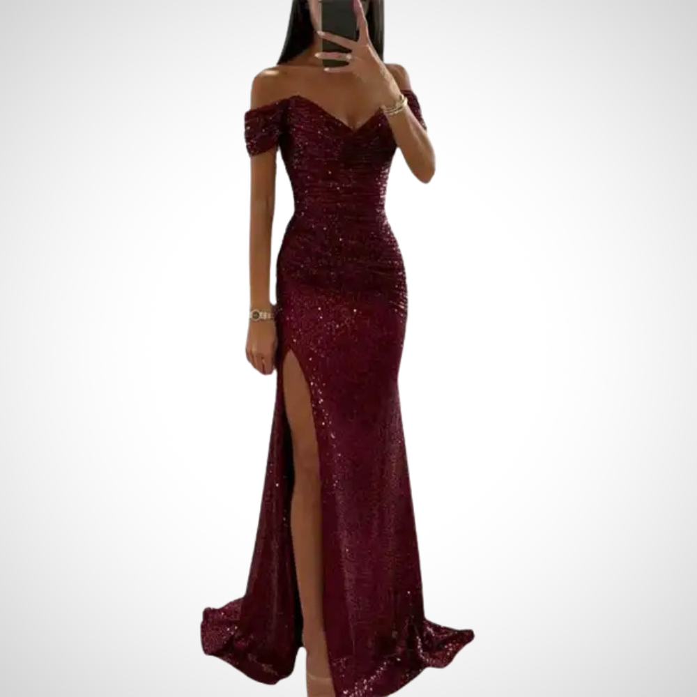 Denne lange, stroppeløse kjolen gir en flytende og elegant silhuett. Dens enkle design fremhever skuldrene og utringningen. Perfekt for spesielle anledninger, den kombinerer komfort og stil.