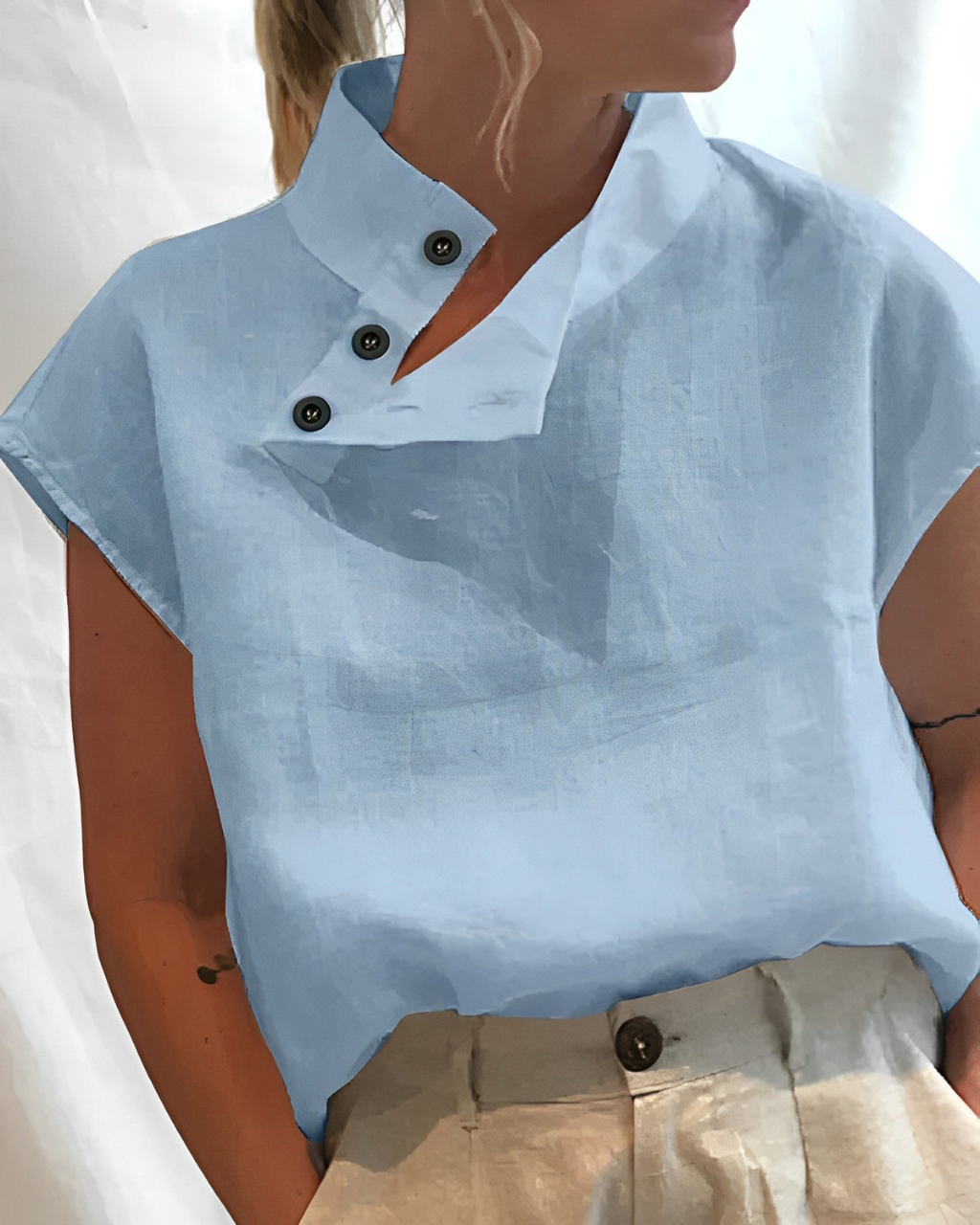 Denne blusen kombinerer et unikt design med bemerkelsesverdig komfort. Den høyre kragen med knapper gir et sofistikert preg til antrekket ditt. Ideell både for en bytur og for en enkel middag.
