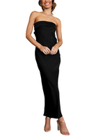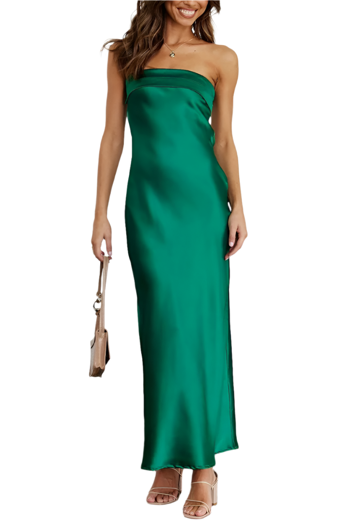 Denne lange, satengkjolen uten stropper former en elegant og feminin silhuett. Lett og luftig, den er ideell for sommerfester, bryllup eller spesielle anledninger. Den silkemyke falden gir et preg av raffinement samtidig som den sikrer optimal komfort. Tilgjengelig i flere farger for å passe til alle stiler.