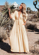 Denna långa, flödande klänning har en rymlig och lätt passform. Dess djupa urringning framhäver silhuetten. Perfekt för sommarens dagar eller eleganta kvällar.
