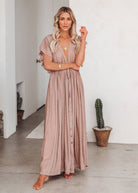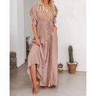 Denna långa, flödande klänning erbjuder en elegant och avslappnad silhuett. Dess djupa urringning framhäver silhuetten. Perfekt för soliga dagar eller sommarkvällar.